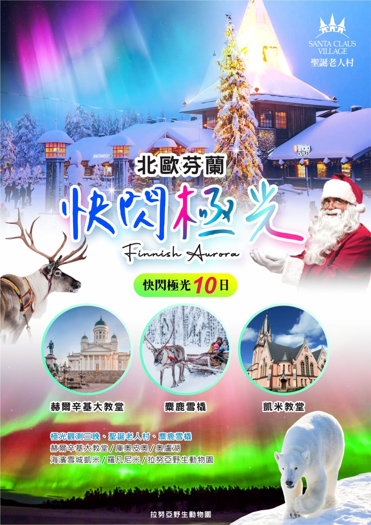 芬蘭旅遊推薦,極光獵人帶您至森林營火區等待夢幻極光出現,一邊享用小吃燒烤;拉努亞極地野生動物園觀察北極圈獨特的動物生態;走訪奧盧主教座堂、奧盧湖、聖誕老人村等知名景點。