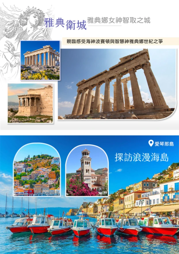 雅典衛城、德爾菲、奧林匹亞遺址、梅提歐拉修道院、愛琴娜島、Outlet購物、蘇尼翁岬日落、憲法廣場、北部山城巡禮。