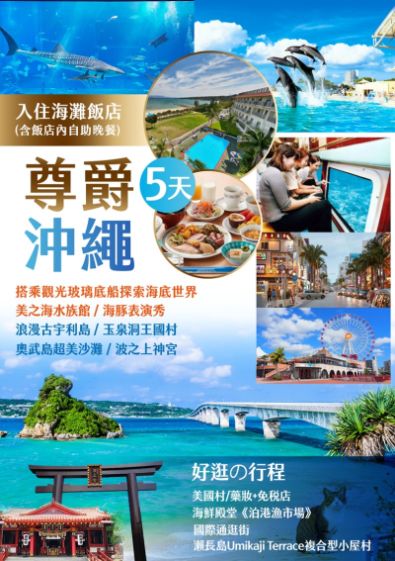 沖繩旅遊首選,入住海灘飯店,搭乘觀光玻璃底船探索沖繩海域的豐富生態;悠遊浪漫東方小希臘瀨長島、古宇利島,盡覽碧藍海色及蔚藍晴空。