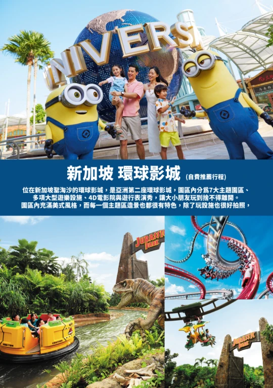 東南亞首座首座好萊塢電影主題公園-「新加坡環球影城」。2010 全新開幕~設有七大主題區,24 個以電影為主題的遊樂設施與景點,其中18 個項目專為新加坡獨家設計打造,全球獨有。除了多個獨一無二,全球首創景點和遊樂設施外,影城內亦設有30 多家異國風味餐廳及流動美食車。讓電影世界的神奇,爲您掀開探險旅程的序幕。鬥惡霸、追明星,您將隨著不同電影的劇情,—個個由螢幕移轉至此,沉浸在星光大道的耀眼光芒。