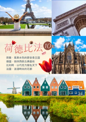 歐洲旅遊首選荷比德法10日遊,必訪景點不錯過。一探巴黎具代表性建築「艾菲爾鐵塔」、宏偉壯麗「凱旋門」,北方威尼斯荷蘭「阿姆斯特丹」,以及以啤酒、節慶活動著稱的德國「杜塞道夫」。