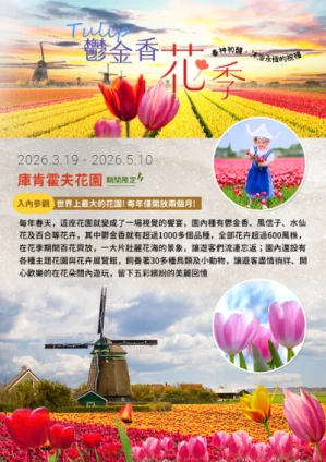 荷蘭庫肯霍夫公園是世界上最著名的、獨一無二的鬱金香花園。“庫肯霍夫”在荷蘭語中為“廚房花園”的意思,庫肯霍夫公園鬱金香的品種、數量、質量及佈置手法都堪稱世界之最.每年僅僅兩個月的開園時間,卻吸引了全球各地的人們紛湧而至,也是感受春花爛漫氣息的最佳地點。庫肯霍夫公園座落在阿姆斯特丹近郊的小鎮利瑟,公園原是雅各伯爵夫人的私人領地,後經富商邀請設計師改建而成,公園整體的景觀設計以英式風格為主,林徑、水池、噴泉問交熾著花圃,鬱金香、風信子,以及各類球莖花卉達600萬株以上,各類工作坊和各種主題的展覽也將公園的文化氛圍搭建的非常巧妙。*2025年開放時間為3月20日至5月11日*