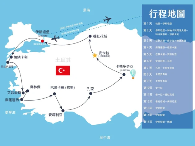 01.桃園出發前往土耳其之經濟艙來回機票及燃油稅金。