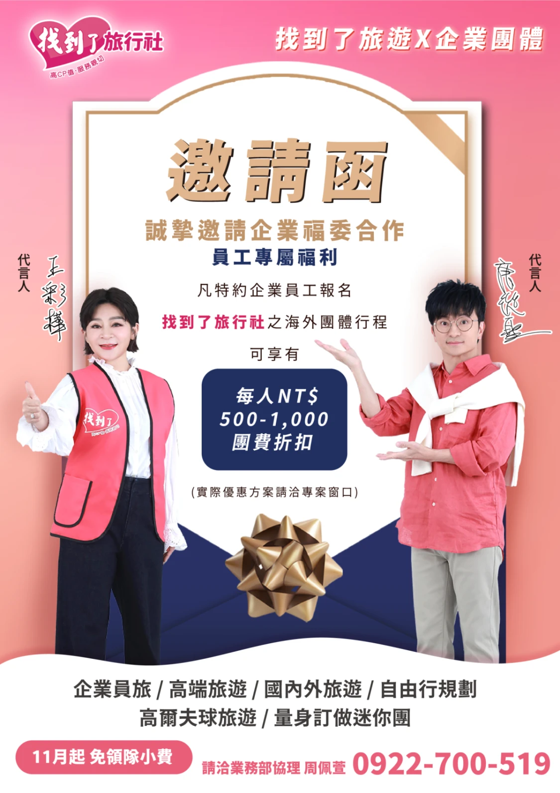 找到了旅行社推出專屬企業VIP合作方案,特別針對各大企業福委會打造,員工參團報名即可享有每人500至1,000元不等的專屬折扣